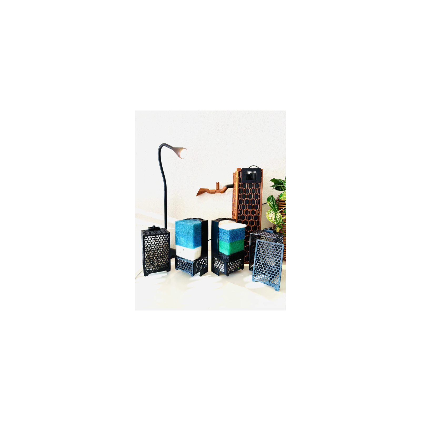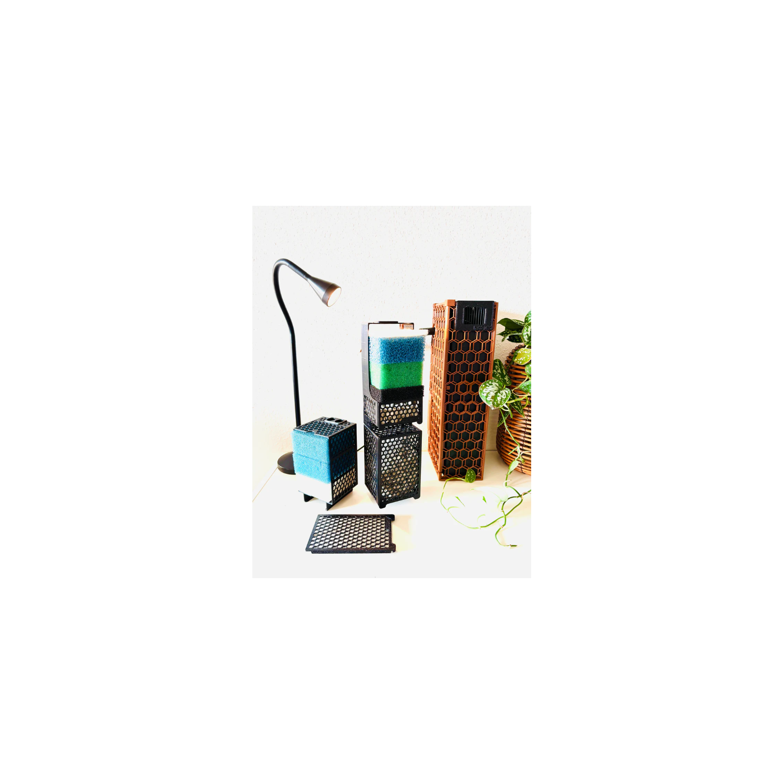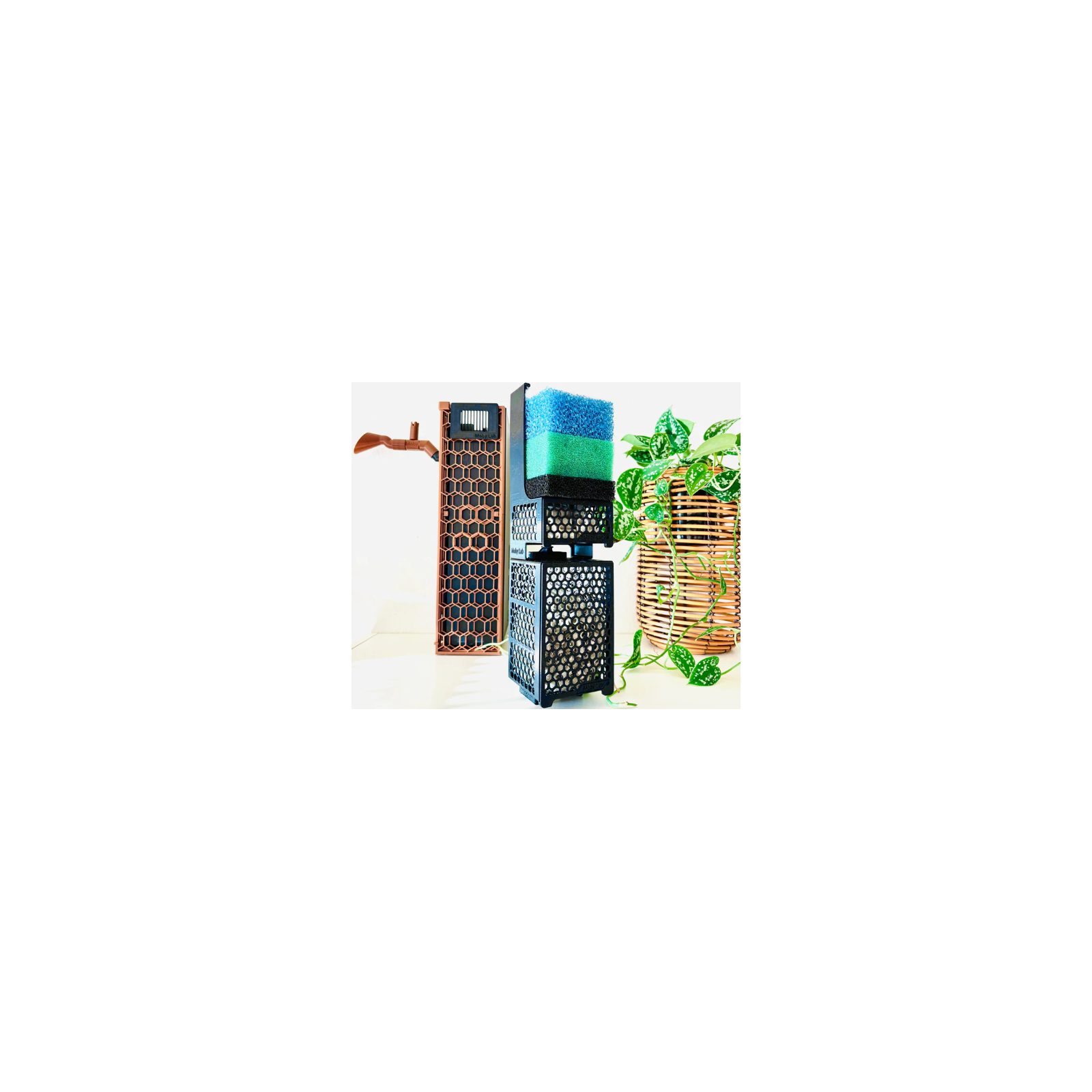 L'ensemble se compose de paniers supérieurs et inférieurs. Le couvercle d'ouverture vous permet de charger facilement tout type de matériau filtrant, tel que des anneaux biologiques en céramique, des pierres de filtre, du charbon actif de Oase, Sera, Tetra, Seachem, Fluval ou toute autre marque.