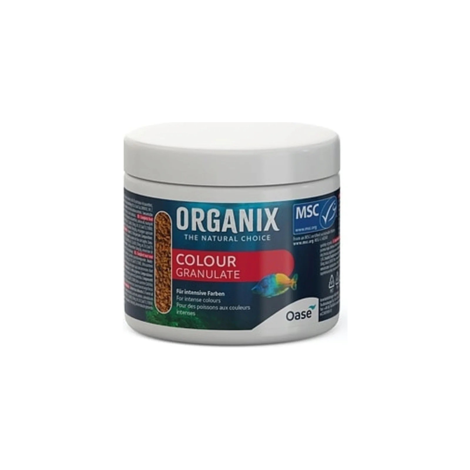 Le granulat de couleur Organix crée des couleurs à la hauteur, non seulement dans l'aquarium communautaire. Le renflement spécial des granules aide à garantir que les ingrédients ne restent pas protégés plus longtemps. Granules de différentes tailles jusqu'à 2 mm de naufrage à différentes vitesses, de sorte que différents poissons puissent être consommés dans leurs zones de natation naturelles. L'alimentation spéciale pour les poissons colorés met en évidence en particulier les parties rouges et soutient une coloration intense. Ceci est rendu possible par une combinaison d'huile de saumon, de bêta-carotène, d'oléoresina capsicum (pigment de poivre) et de canicaxanthine.