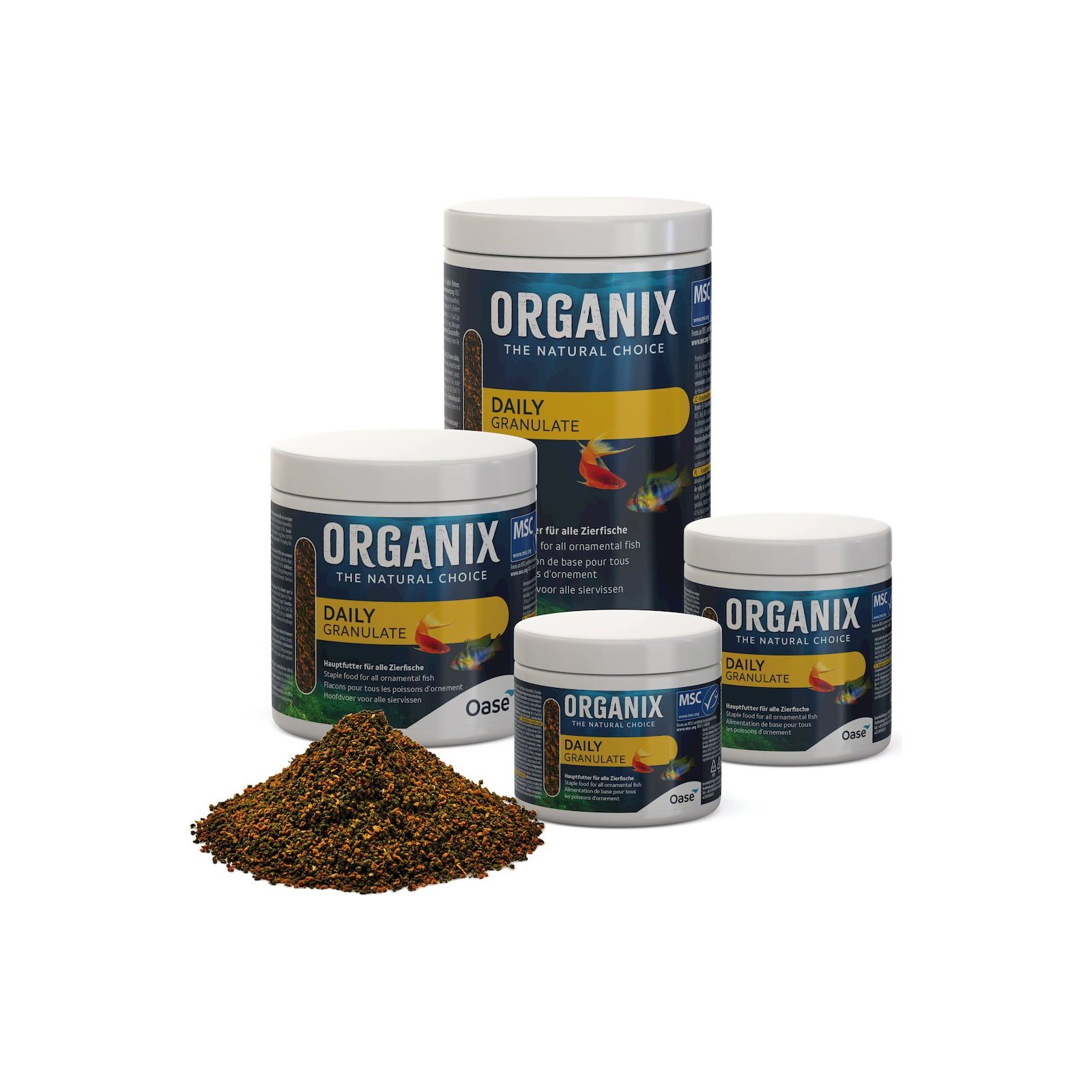 Organix Daily Granulate combina granuli di dimensioni, fino a 2 mm di diametro, il che lo rende in mangime ottimale per diverse varietà di pesci, anche di diverse dimensioni. Le diverse dimensioni dei granuli offrono anche il vantaggio che il mangime varia nel suo comportamento di affondamento, il che significa che tutti gli abitanti dell'acquario possono assorbire il cibo nella loro zona di nuoto senza stress.