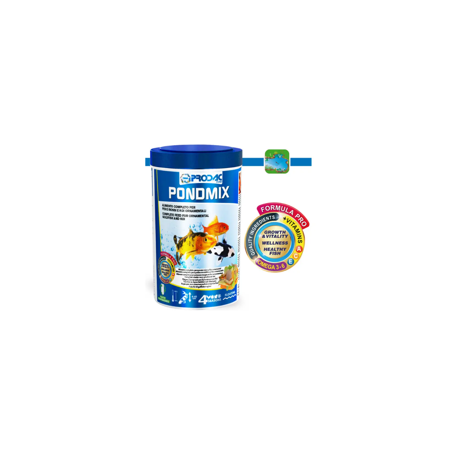Alimento completo in scaglie e sticks per pesci di piccola e media taglia che vivono in laghetti ornamentali: pesci rossi, carpe koi, alborelle, tinche.