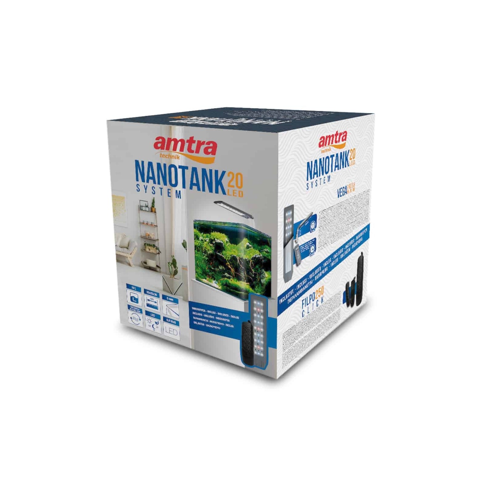 Réservoir de verre 25x25x30 cm complet avec système d'éclairage AMTRA Vega LED Eau fresque 6.8 watts et filtre AMTRA Filpo cliquez 250.