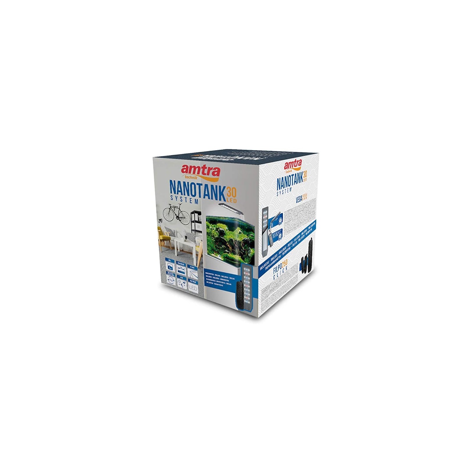 Réservoir de verre 25x25x30 cm complet avec système d'éclairage AMTRA Vega LED Eau fresque 6.8 watts et filtre AMTRA Filpo cliquez 250.
