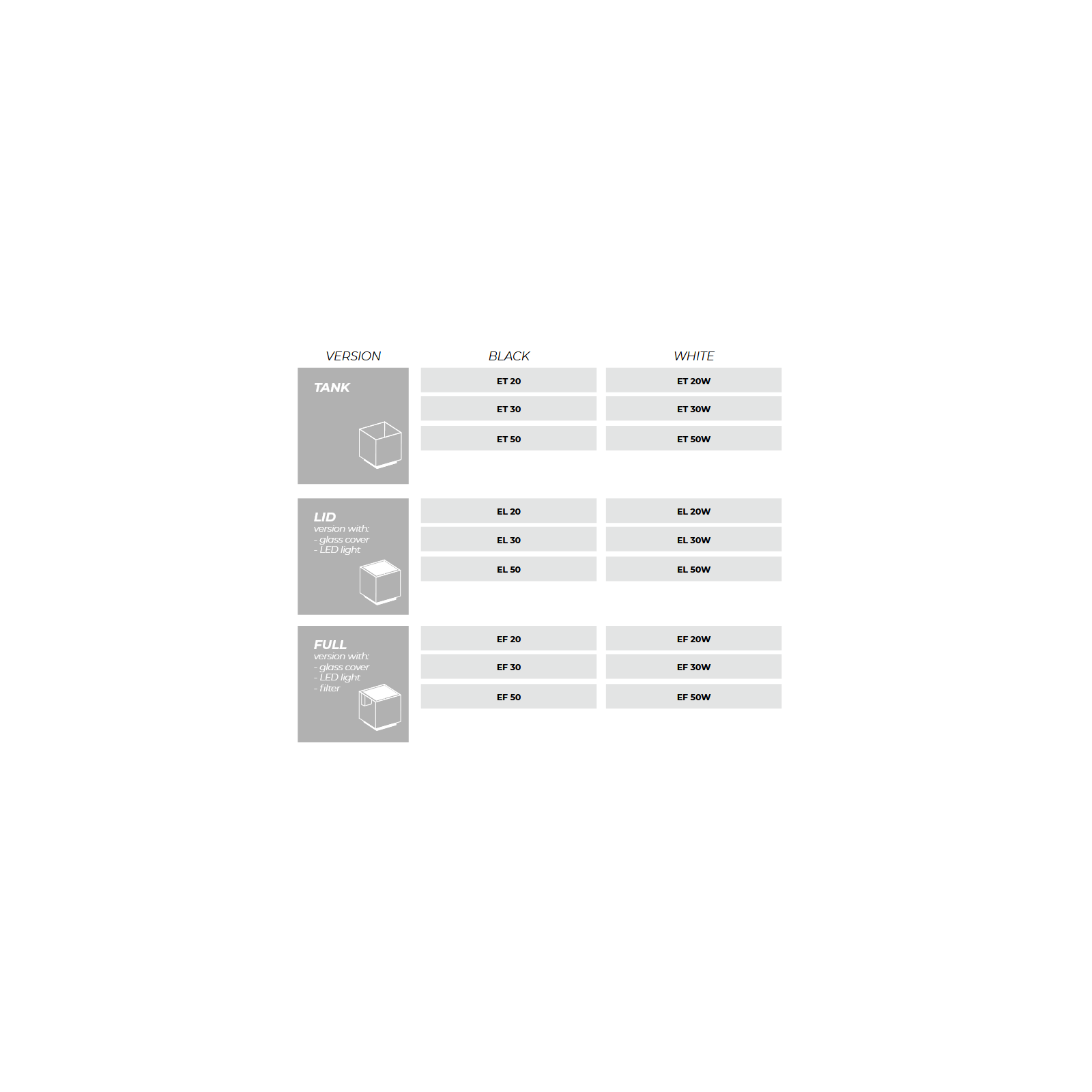 Taille compacte et pratique, Newa Ego se compose d'une gamme de 3 volumes (20 LT, 30 LT, 50 LT) qui permettent une large personnalisation. Disponible dans la version de la version du réservoir, couvercle avec des lumières et du cristal de couverture ou une compréhension complète de chaque élément essentiel à un aquarium.