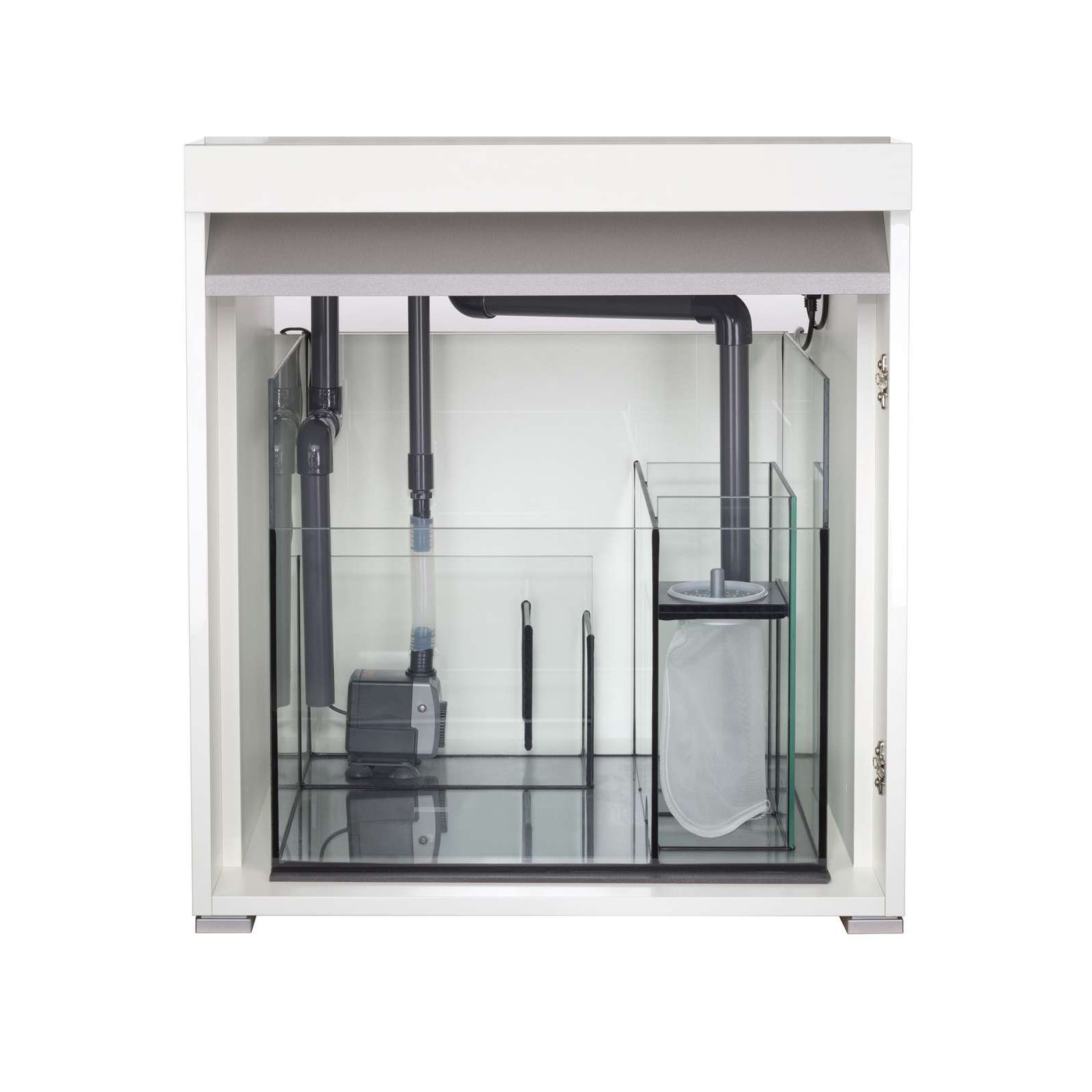 Les plaques de verre blanc pur offrent une vision claire du monde sous-marin exotique. L'éclairage LED spécialement conçu est très efficace. La protection de trop-plein vous donne la sécurité. Le lavabo technique spacieux dans la base mobile facilite la maintenance. Vous ne sentirez absolument rien de l'arbre d'échappement breveté et silencieux. La pompe à puissance (Eheim Compacton 3000) est incluse. Bien sûr, tous les tubes et câbles sont préassemblés ("Plug & Play").