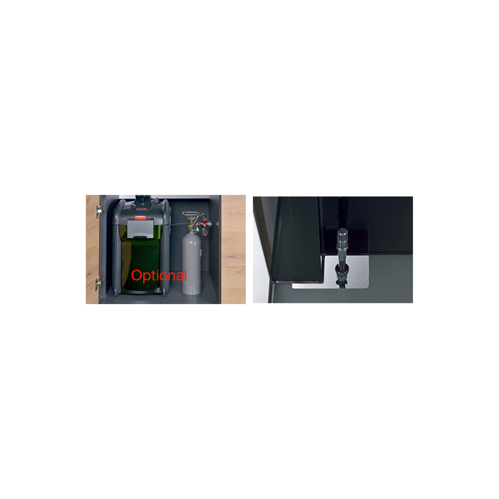 - Entrée de filtre fraîchement perceptible près de la paroi arrière de l'aquarium à travers un trou pratiqué sur le fond et une passe.