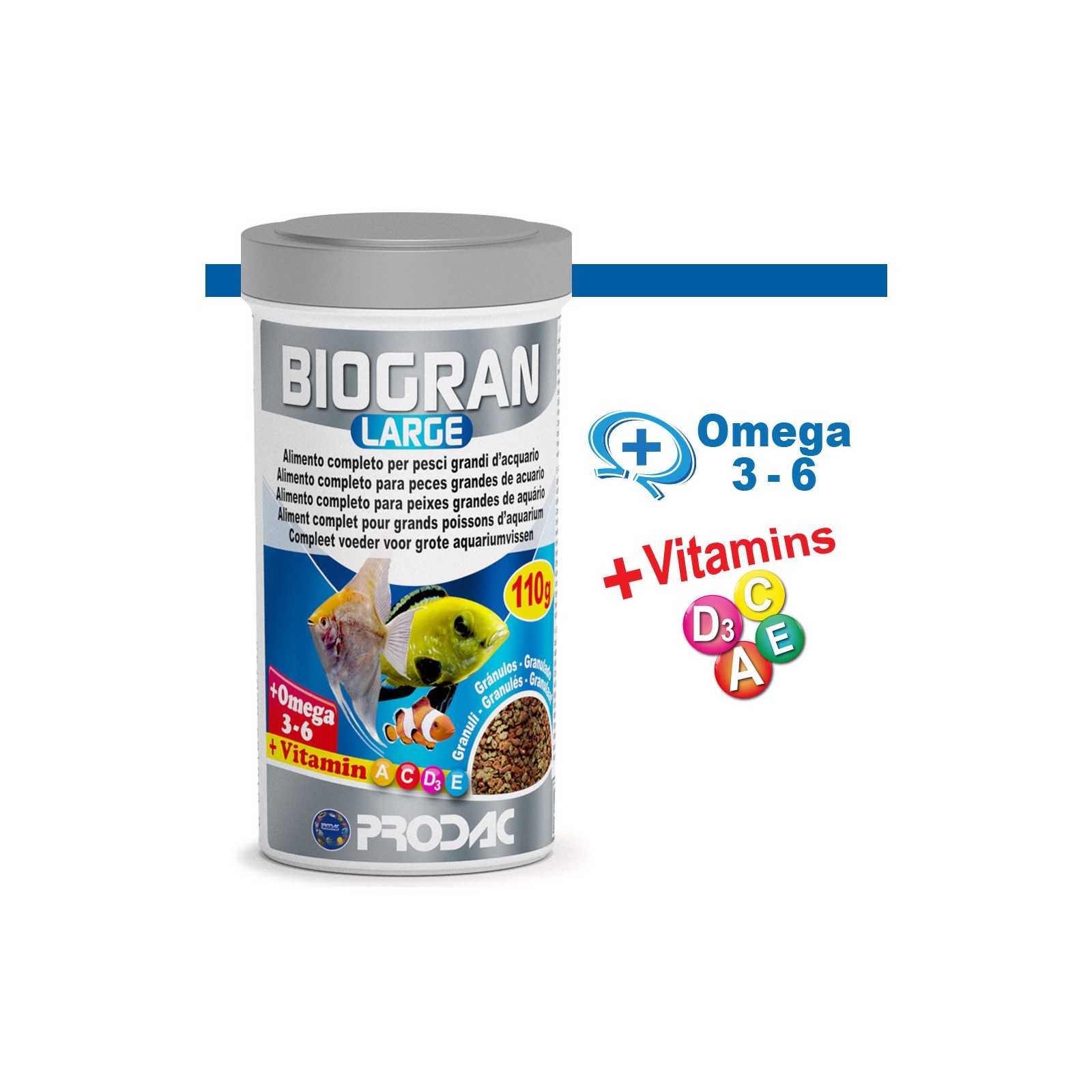 Prodac Biogran Grand est un aliment complet pour les poissons d'aquarium formulés pour garantir une nutrition équilibrée, une santé et une vitalité. Contient des vitamines essentielles (A, C, D3, E) qui soutiennent la croissance, le système immunitaire, le développement osseux, la fonction visuelle et la protection antioxydante, prévenant les carences nutritionnelles. La présence d'acides gras oméga-3 et oméga-6 favorise la stabilité des membranes cellulaires, une réponse immunitaire correcte, un développement de la reproduction et une couleur naturelle intense.