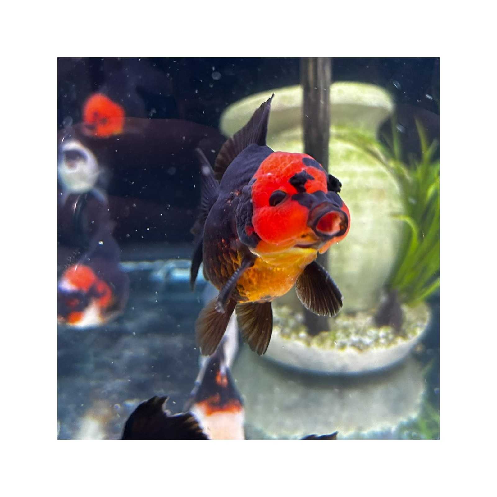 Chaque spécimen est unique: la distribution de couleurs et l'extension de la Wen ne sont jamais identiques, ce qui rend chaque oranda tricolor panda un sujet incomparable.