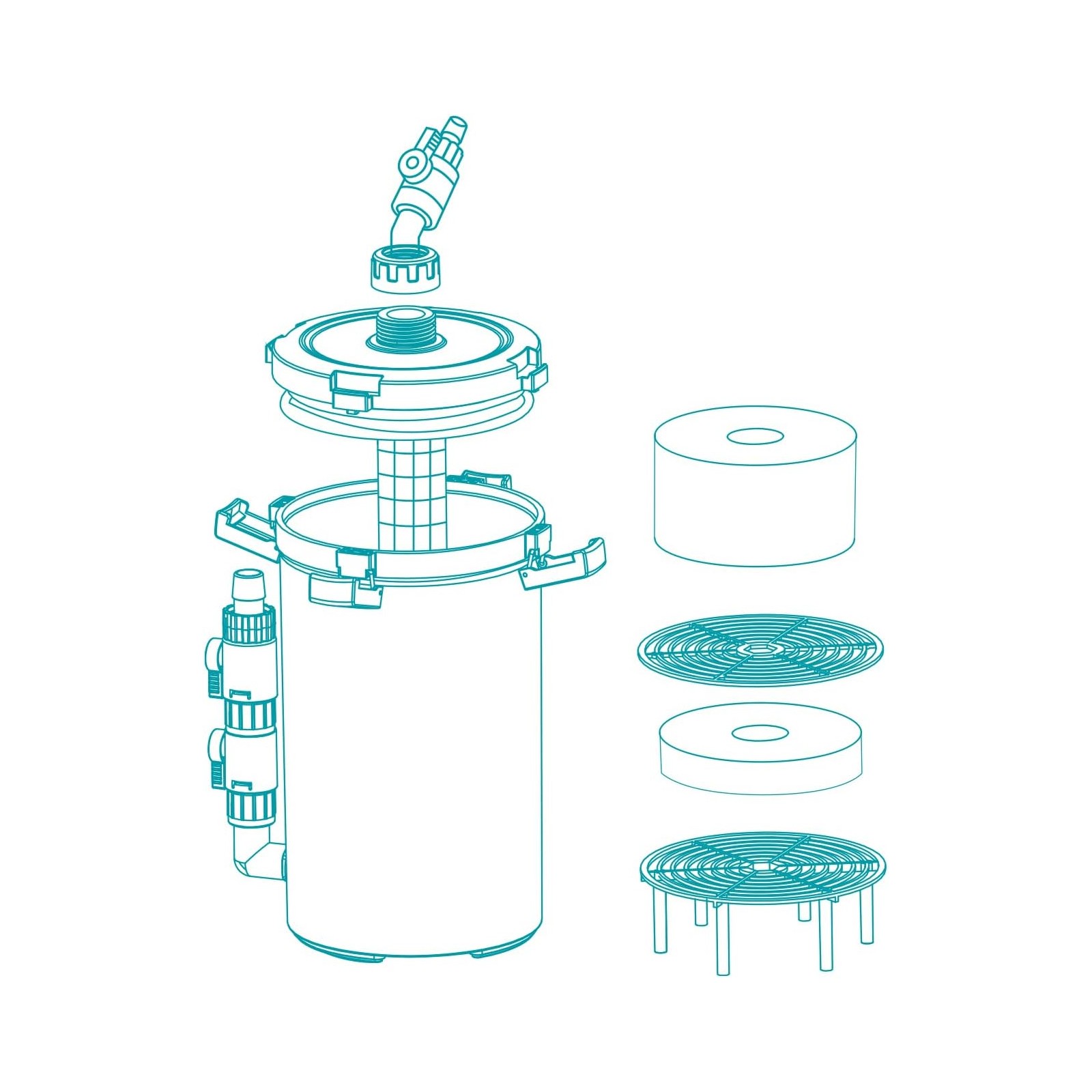 Vous installez du réservoir et améliorez l'efficacité du système de filtrage principal grâce à une pré-filtration à plusieurs niveaux.