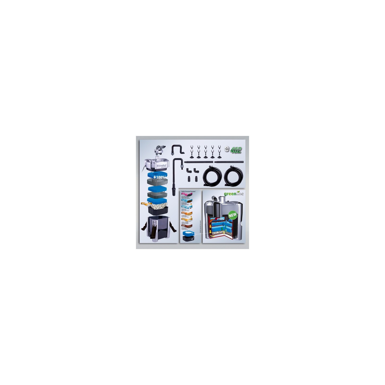 Pompe très calme à 450l / h. Préfiltre breveté: 100% de plus en plus que dans le modèle 401. Performances de filtrage biologique élevées avec volume de 4,6 L, Waterstop, robinettes de tubes réglables à 360 °, masses de filtrage de remplacement faciles