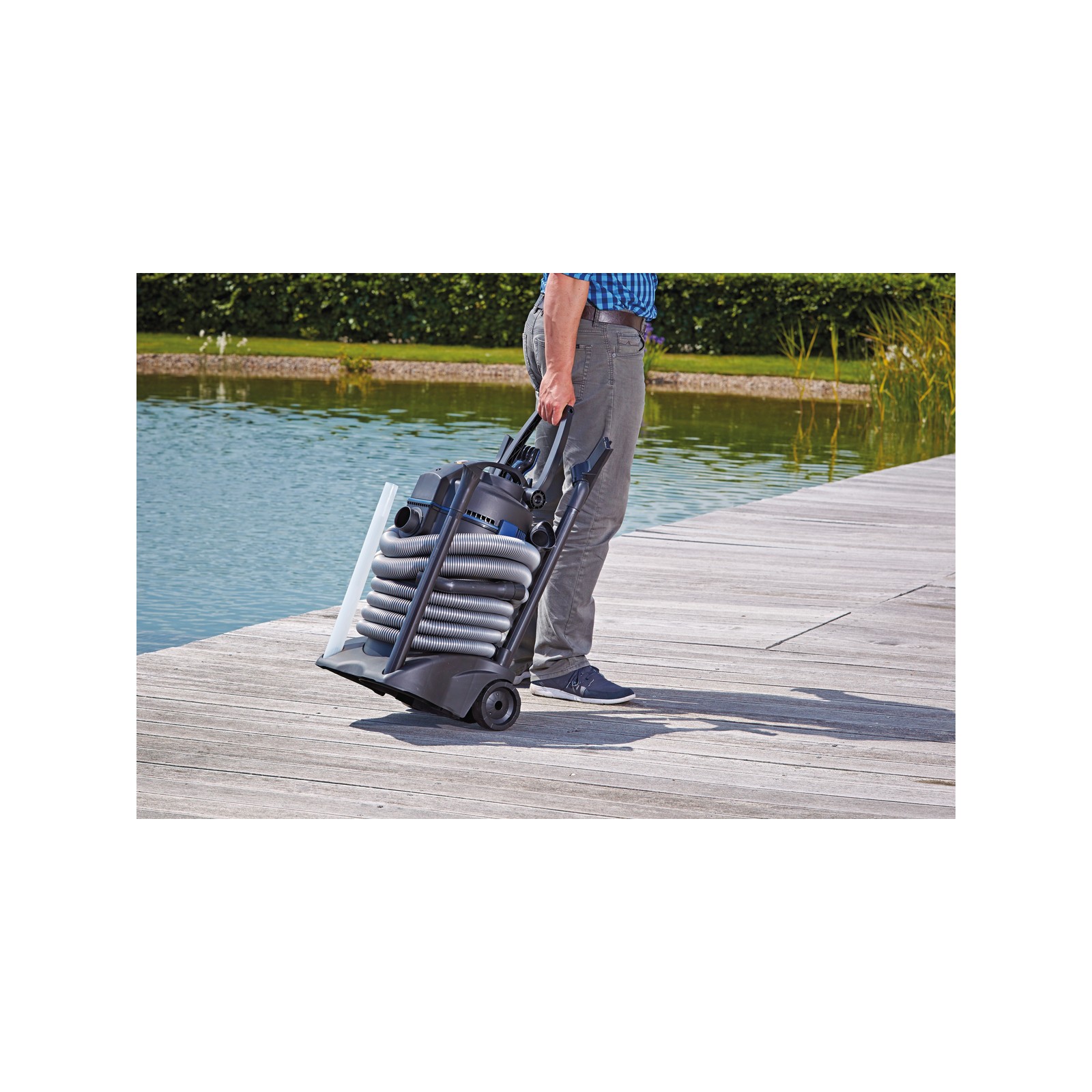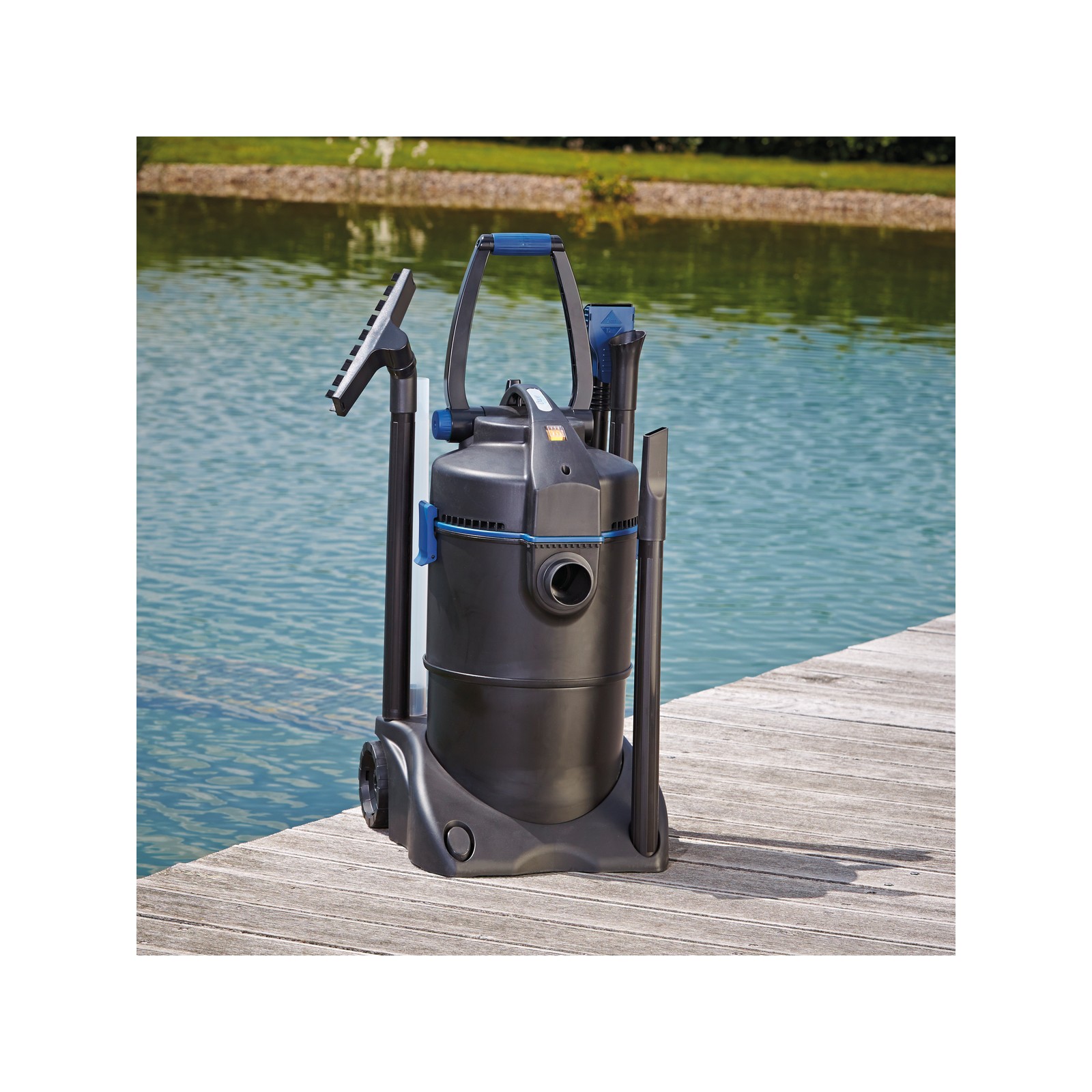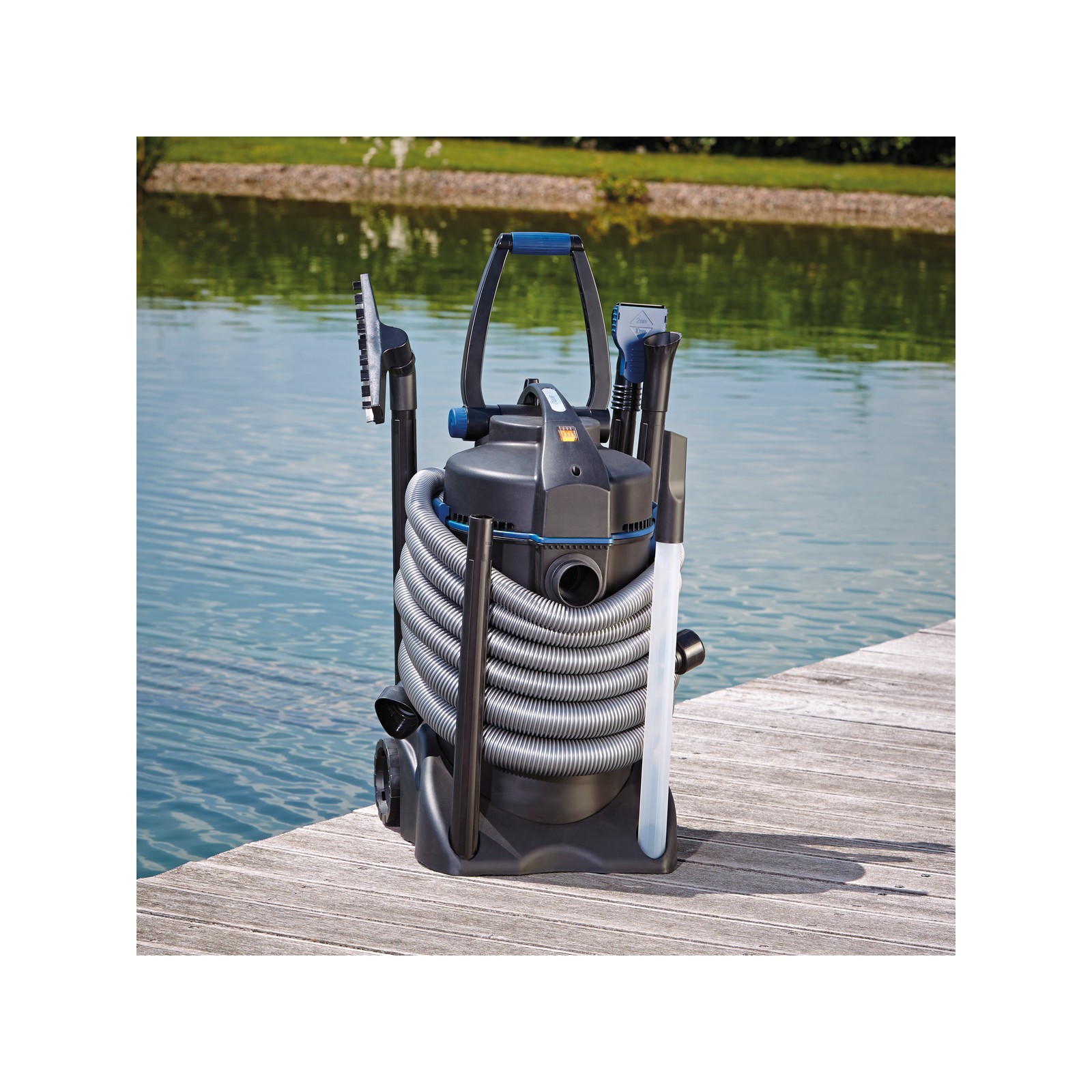 LesOase Pondovac 3 C'est un aspirateur puissant conçu pour un nettoyage efficace des étangs de jardin, des piscines, des étangs de baignade et des surfaces domestiques humides. Grâce à Système de deux chambres breveté, il permet un 'Aspiration continue sans interruption, vous permettant de travailler rapidement et efficacement.