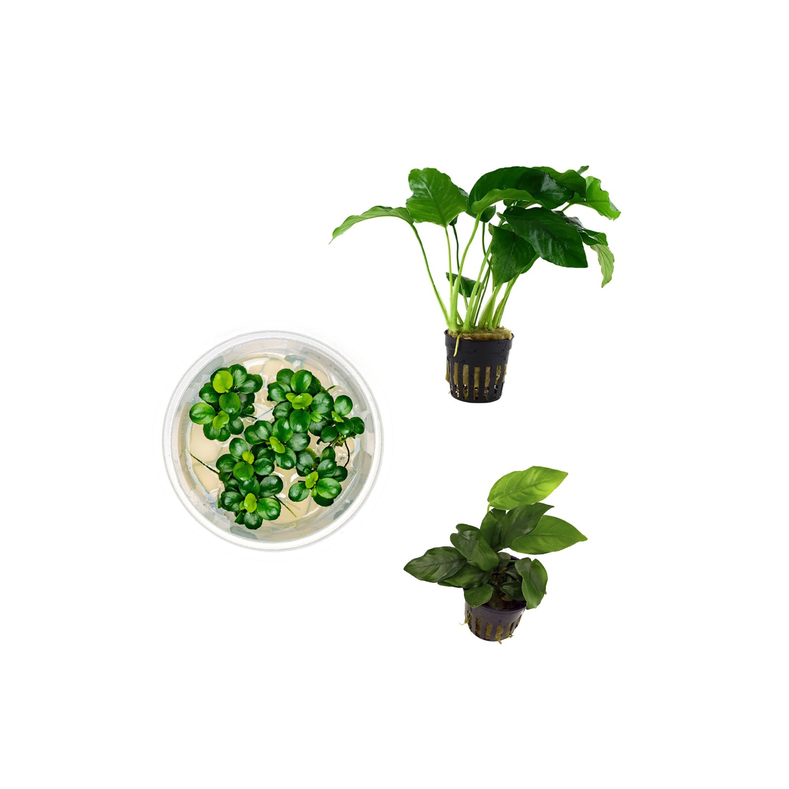 Comprend trois variétés de Anubias Compact et décoratif: Anubias barteri, Anubias Nana Barteri e Anubias Mini monnaie.
