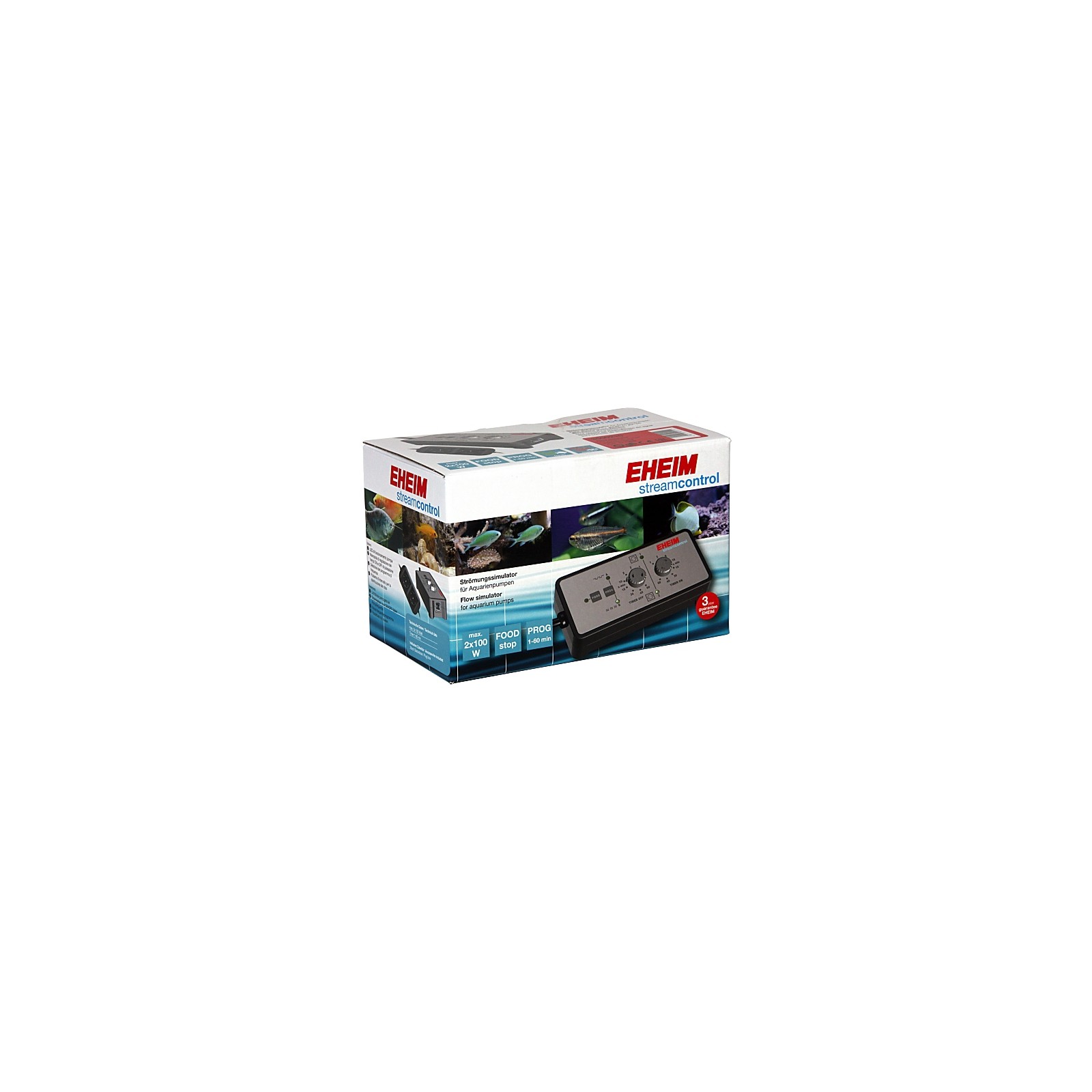 Il controllo del flusso EHEIM è un controller della pompa di flusso per simulare i movimenti naturali dell'acqua come nei fiumi o nelle barriere coralline . Il controllo del flusso EHEIM ha due programmi con intervalli di tempo regolabili individualmente e un pulsante di pausa per l'alimentazione. Programma A per un flusso alternato, cioè le pompe vengono accese e spente alternativamente. Nel programma B c'era un controllo sincrono delle pompe, cioè entrambe le pompe venivano accese e spente contemporaneamente. Il controllo del flusso EHEIM ha due socket. Ciascuno degli slot può essere caricato con un massimo di 100 watt. È anche possibile collegare più pompe ad una presa. Non superare il carico massimo di 100 W per presa!