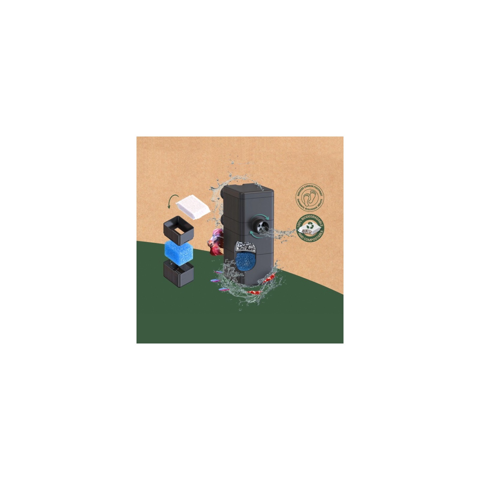 Les Filtre bio 200 intégré, avec une capacité allant jusqu'à 270 l / h, utilisez le système Petit-déjeuner-box Pour une filtration sur trois niveaux.