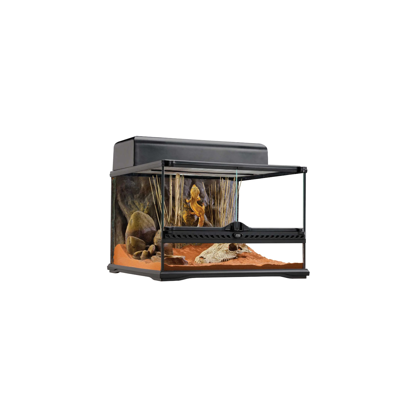 Le Terrarium de la vitre EXO Ground est l'habitat idéal pour les reptiles ou les amphibiens, conçus par les herpèteologues européens. Les portes avant ouvertes facilitent la maintenance et l'alimentation électrique. Un verrou spécialement conçu empêche les fuites et les portes peut être ouverte séparément. La ventilation du réseau supérieur permet le passage des rayons UVB et des rayons infrarouges et est complètement amovible pour faciliter la décoration ou le nettoyage. À l'arrière du couvercle en mailles, il y a 5 entrées réarrangées pour les fils ou les tubes des deux côtés, pour installer les éléments tels que les roches de chauffage, les cascades, les capteurs, etc. à l'intérieur du terrarium.