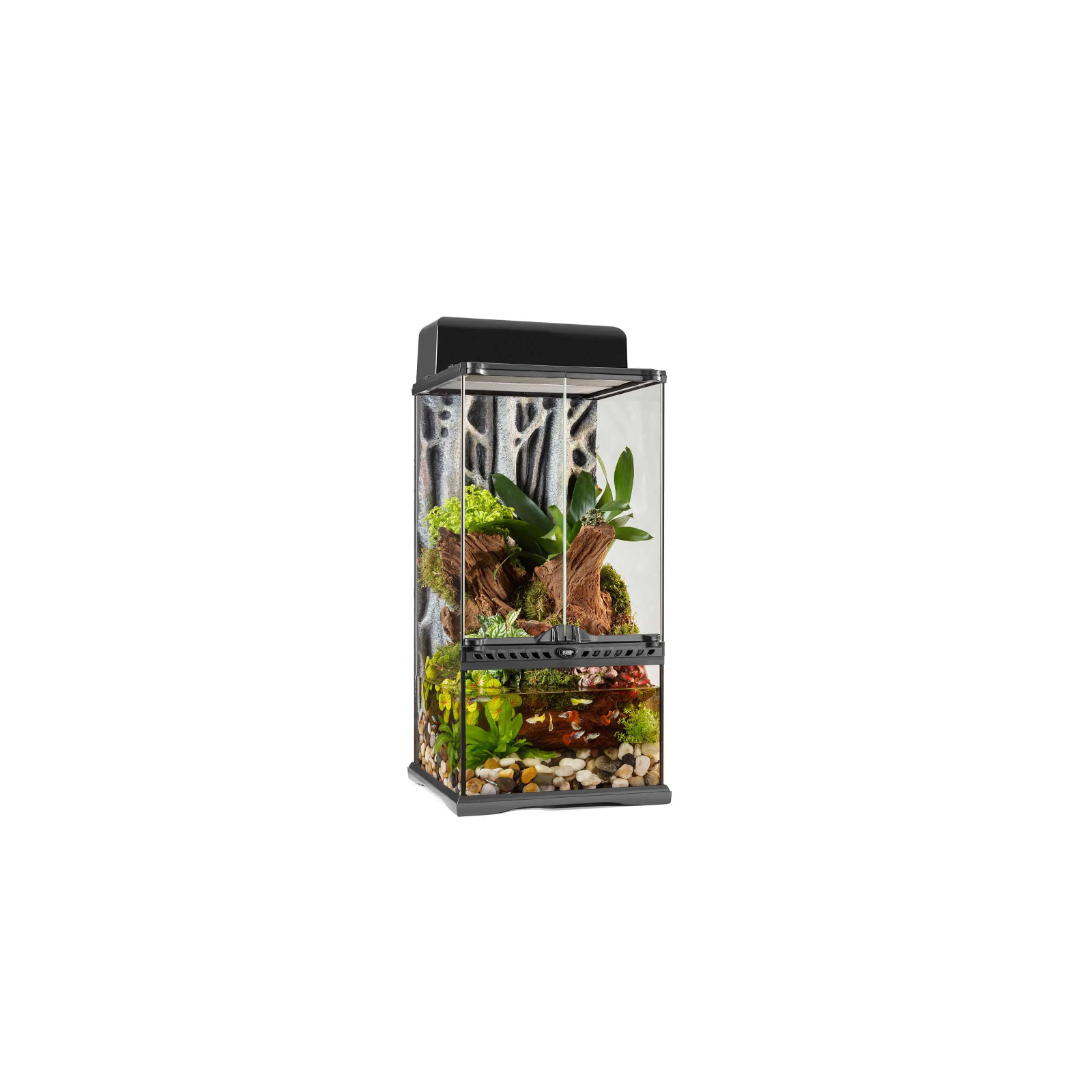 Il paludario unisce il meglio dei due mondi: la parte inferiore presenta un vetro frontale extra alto che permette un maggiore livello e volume d’acqua rispetto ai terrari tradizionali.