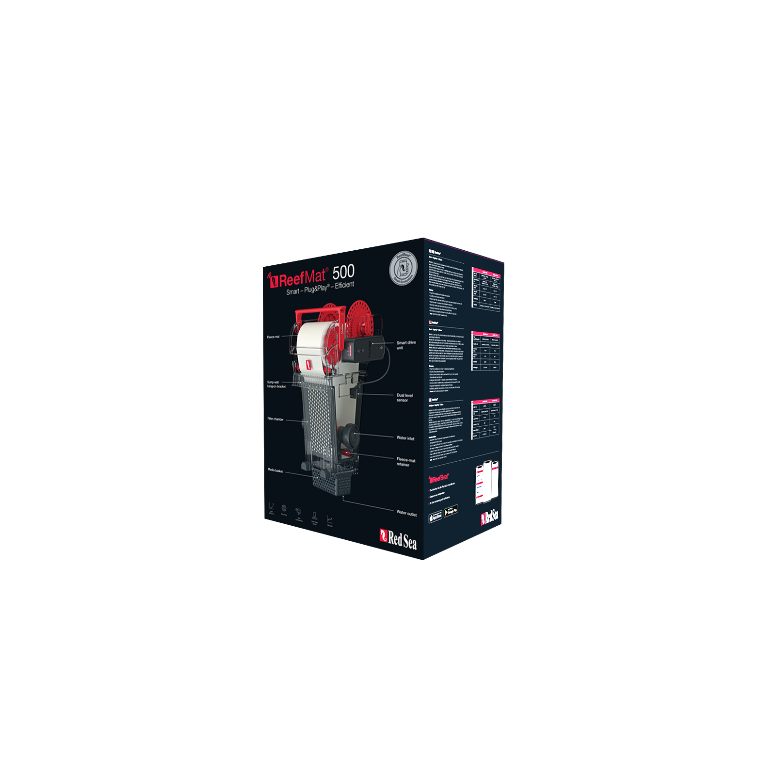 À travers l'application ReefbeatVous pouvez vérifier le statut du filtre en temps réel, recevoir des notifications d'avancement, des blocs ou des déplacements d'épuisement et consultez des données à l'utilisation du temps. La conception du récifmat 500 est Plug & playavec Rouleau pré-installé, Moteur intégré et Supports polyvalents qui permettent une installation facile même en puisard avec un espace limité.