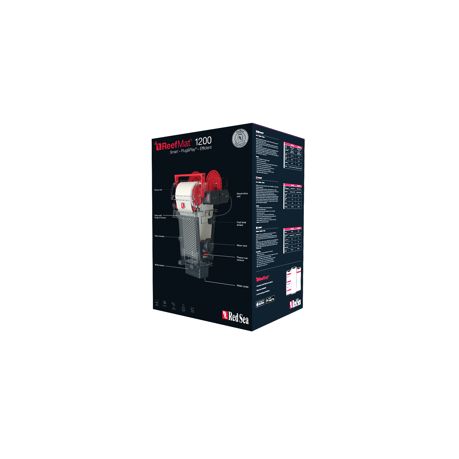 Totalement Plug & playLe Reefmat 1200 est fourni avec un rouleau pré-installé, un moteur intégré et un système de fixation flexible pour une installation de puisard rapide de différentes configurations. Compatibilité avec l'application Reefbeat Il vous permet de gérer toutes les fonctions de filtrage du mode SMART et centralisé, y compris la surveillance de l'usure du rouleau, le contrôle d'avancement manuel et les notifications immédiates en cas de dysfonctionnement ou de roulement en rupture de stock.