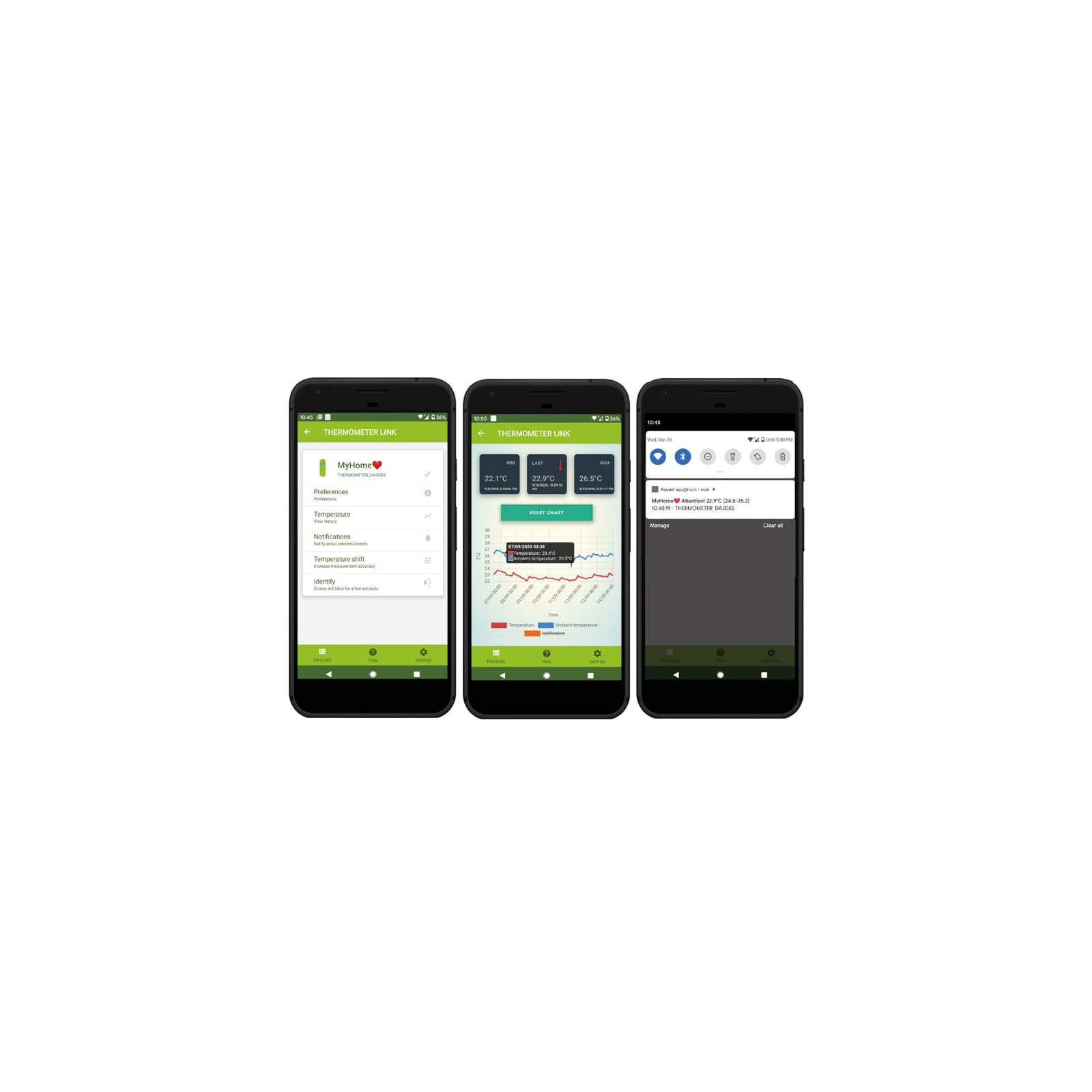 D'ora in poi puoi impostare, controllare e tenere d'occhio la temperatura all'interno e intorno all'acquario e ricevere un messaggio di avviso quando si notano deviazioni dall'intervallo preimpostato (massimo e minimo).