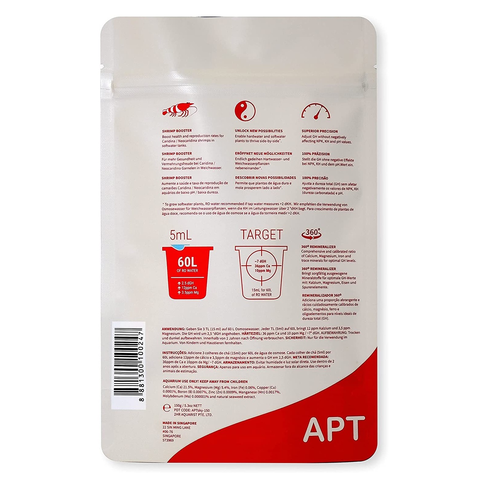 Tous les 3,5 g / 5 ml pour 60 litres ajoute 12 ppm de calcium et de 3,5 ppm de magnésium (+2,5 DGH)