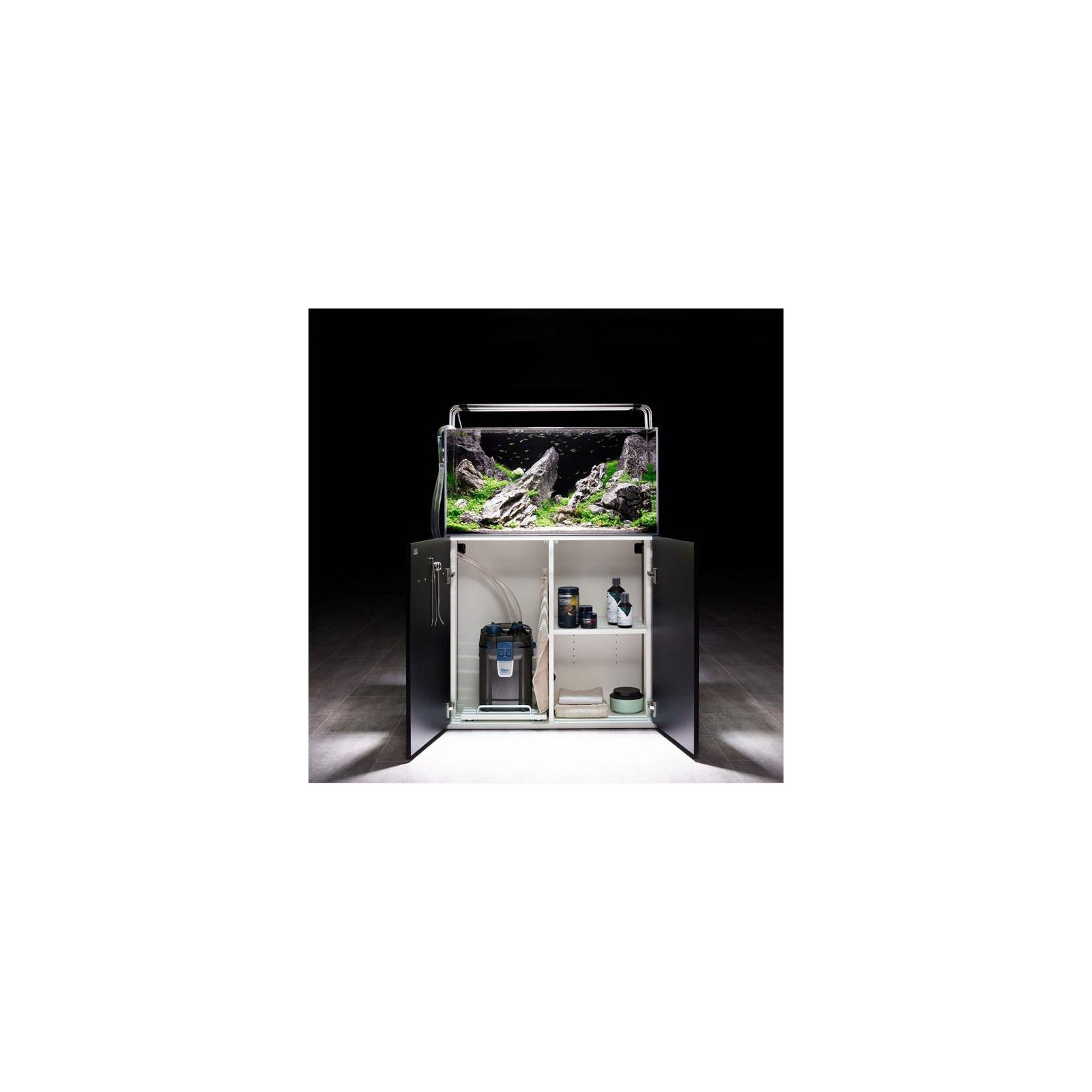 Ensemble coordonné: les aquariums et les meubles de base, l'oase Scarperline sont parfaitement coordonnés et surprises pour des détails bien étudiés et pratiques.