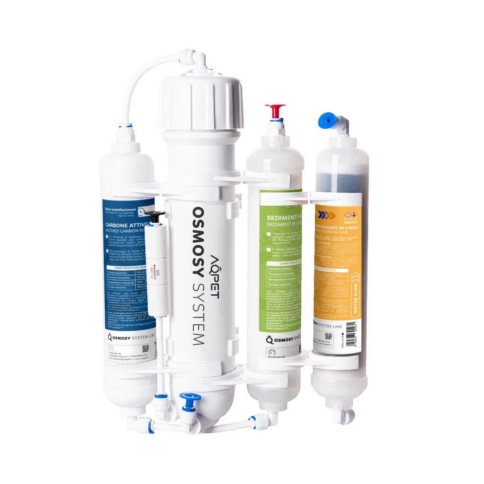 Grâce à l'application Application, la membrane vous permet de séparer, via un processus osmotique, les éléments indésirables en fournissant de l'eau pure. La réduction moyenne des substances indésirables est estimée à environ 96 à 98% de réduction. Le système est également accompagné de deux cartouches, de sédiments de 5um et de charbon, destinés à effectuer une pré-dépôt chimique et mécanique avant que l'eau puisse être traitée à travers la membrane, cela garantit une plus grande qualité des valeurs de sortie et une plus grande durée de vie. En particulier, la cartouche de charbon active élimine le chlore de l'eau du robinet qui présente un effet particulièrement négatif sur la durée de vie de la membrane. Enfin, il y a une autre cartouche contenant une résine de lit mélangée qui vise à réduire presque totalement les valeurs TDS à projeter n °3-, PO43-, Si4.