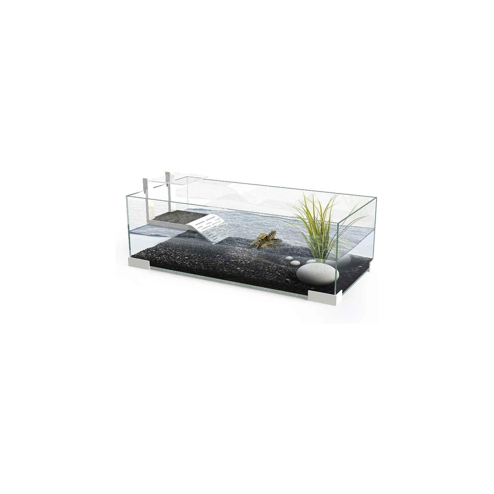 Tartarughiera in vetro dal design semplice ed elegante dotata di rampa in plastica di elevata qualità per permettere alle tartarughe di sostare fuori dall'acqua per esporsi meglio alla fonte di calore.