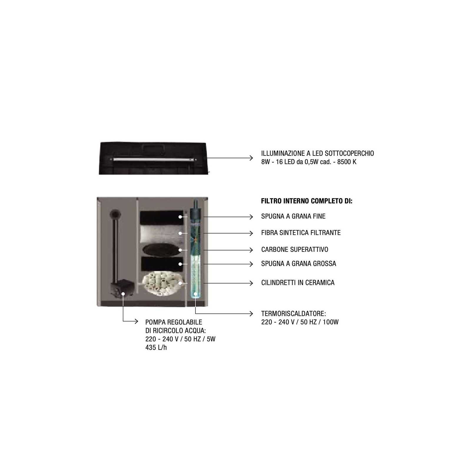 Complete with LED lighting, filter and filter materials and heater