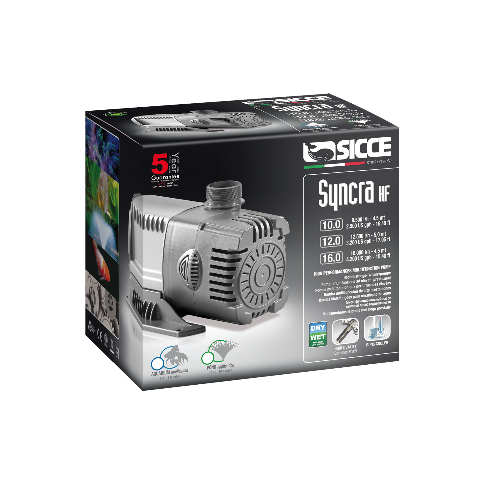 The Syncra HF pump line has been designed for a wide range of applications: Laghetti, fountains, drainage, cooling systems as well as for use in freshwater and marine water aquariums, filtering systems and protein-skimmer and for many others Uses where a great water handling is needed.