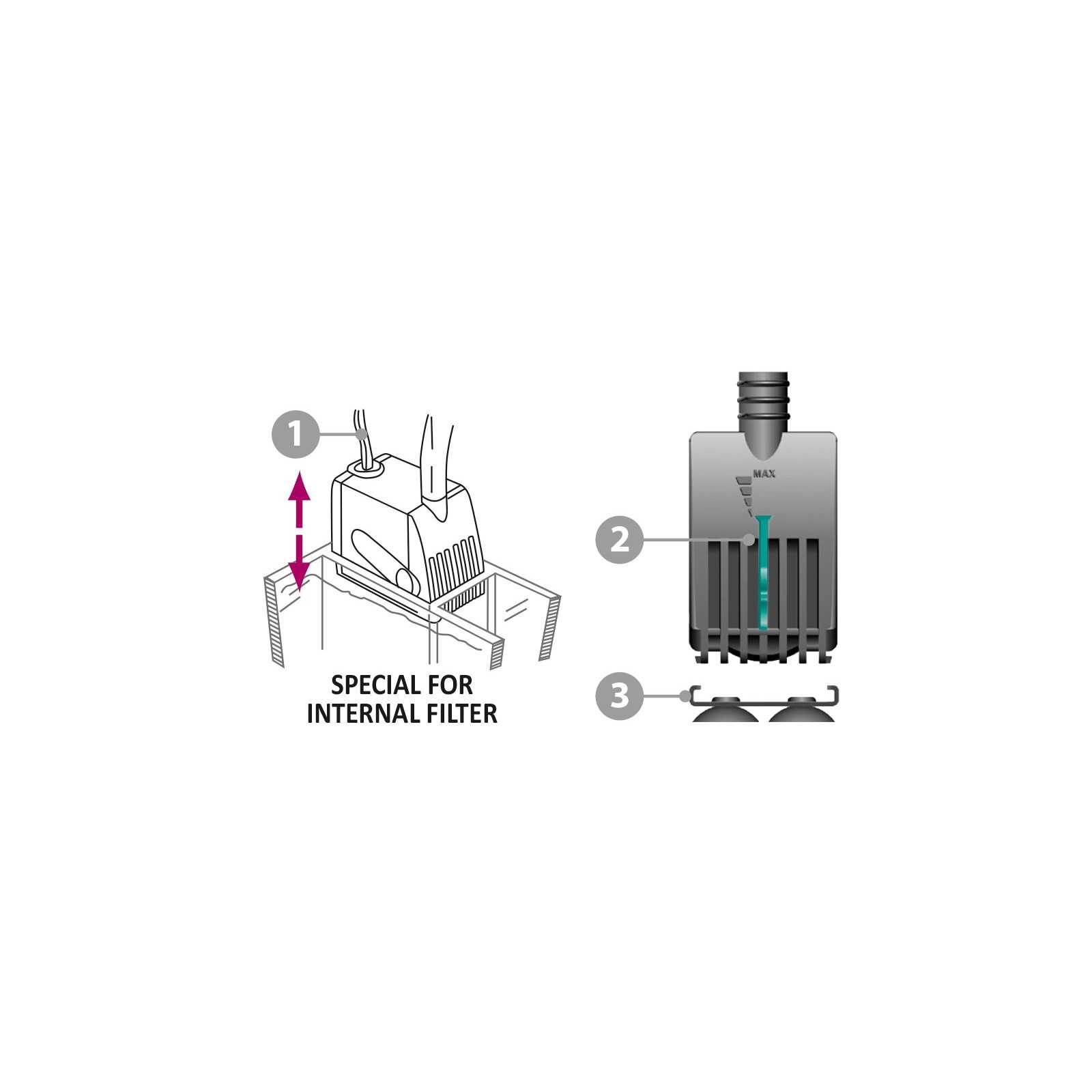 Economic submersible mini-pump. Miniaturized, silent. Its special shape allows you to insert it easily into all filtering systems. The power cord is upwardly facilitates the placement of the pump in restricted spaces. Minimum maintenance.