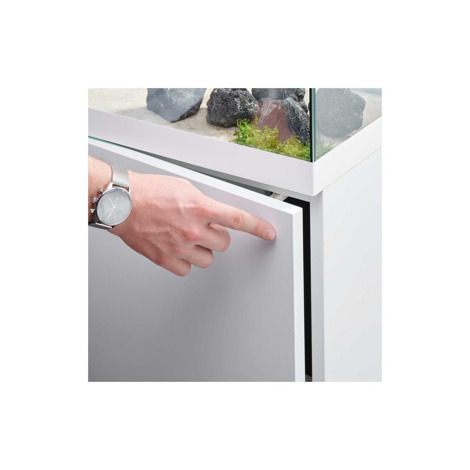 Suitable for aquariums up to 85 liters, this elegant design cabinet has a push-to-open function, aluminum feet and a practical shelf.