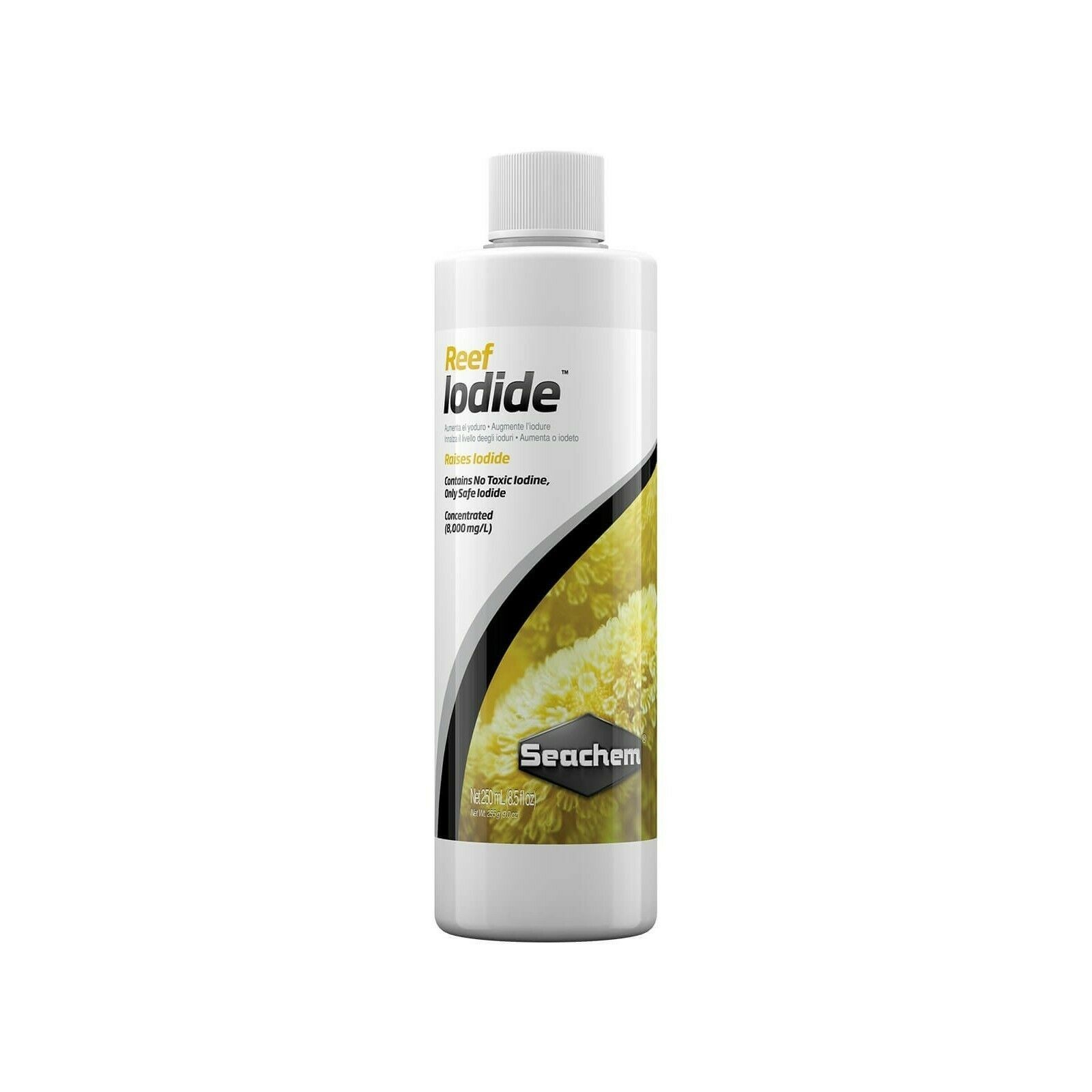 Reef IodideTM is a concentrated source (8,000 mg/l) and balanced of stabilized potax iodide that in replenished barrier aquariums and keeps iodines at natural marine water levels. In no case the iodines in Reef Iodide convert into free iodine