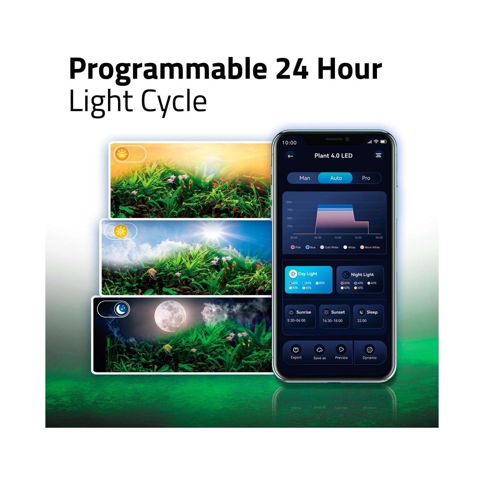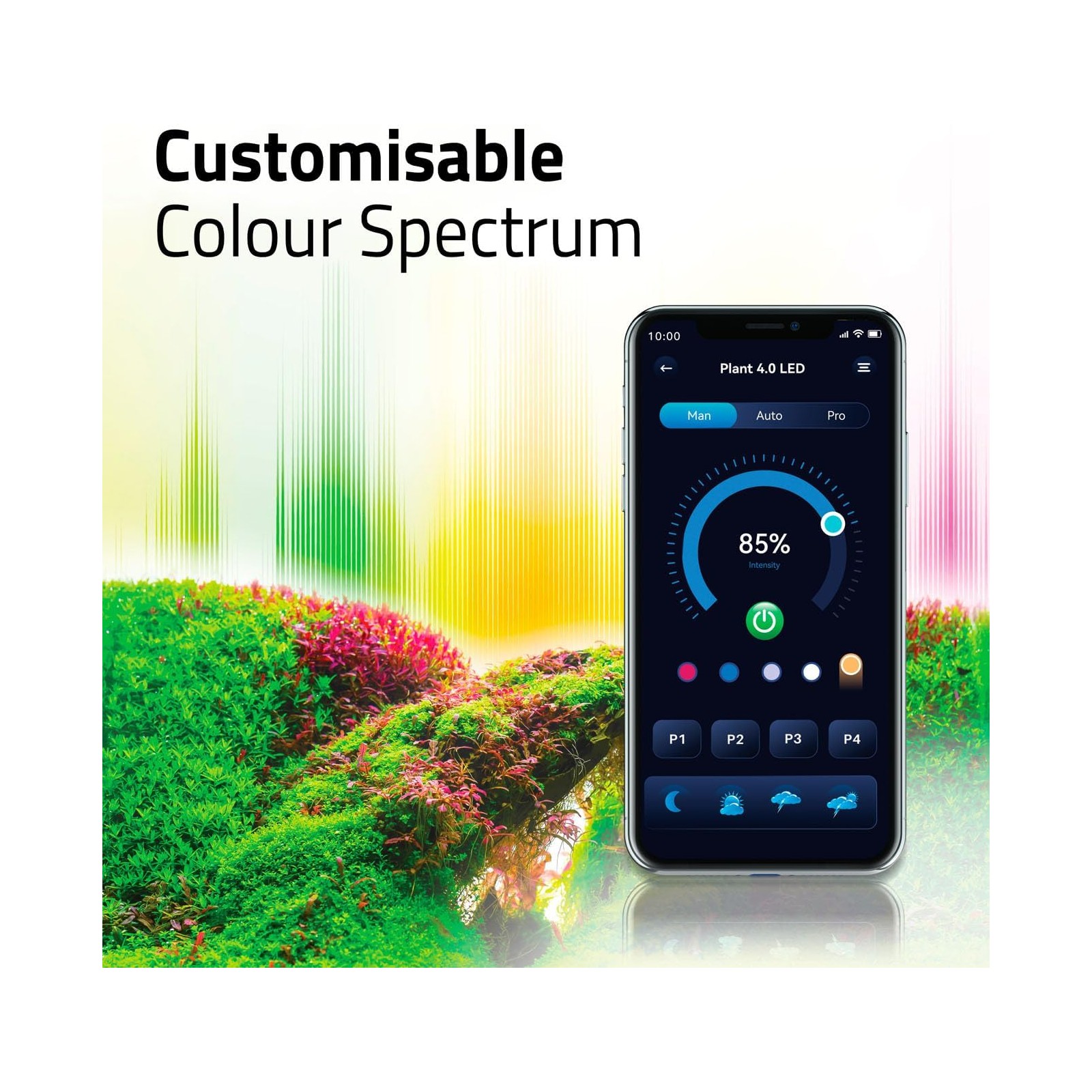 The bar is equipped with Wireless control via the Fluval Connect app, which allows you to manage intensity, day-night cycles, gradual transitions (sunrise and sunset), and create customized profiles with extreme simplicity, even for users to the first experience.
