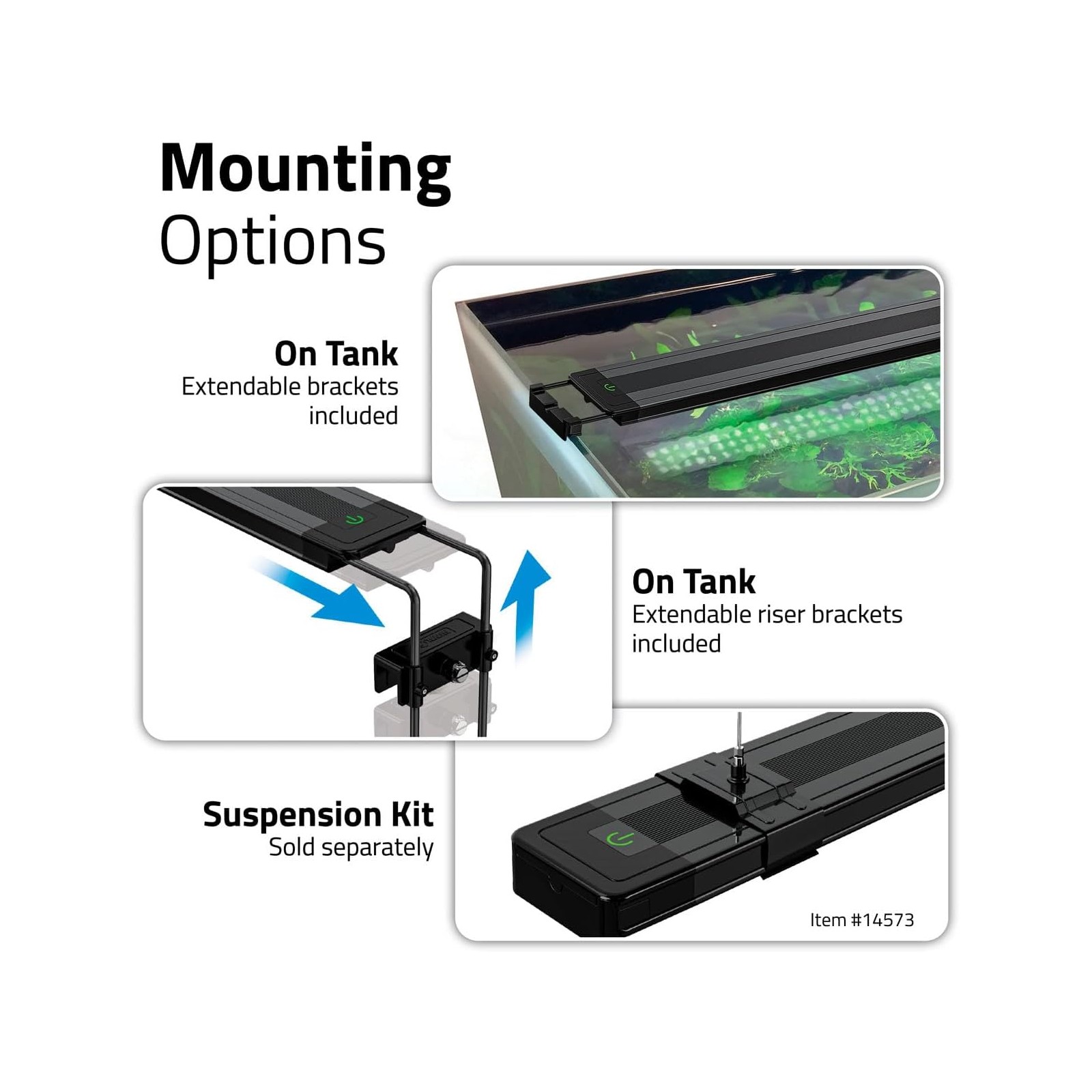 Complete the product a robust and functional design, with extensible arms included for installation on aquariums of various sizes, and the possibility of suspension via optional kit. The efficient dissipation of heat, guaranteed by the aluminum body, contributes to a long life and stable performance over time.