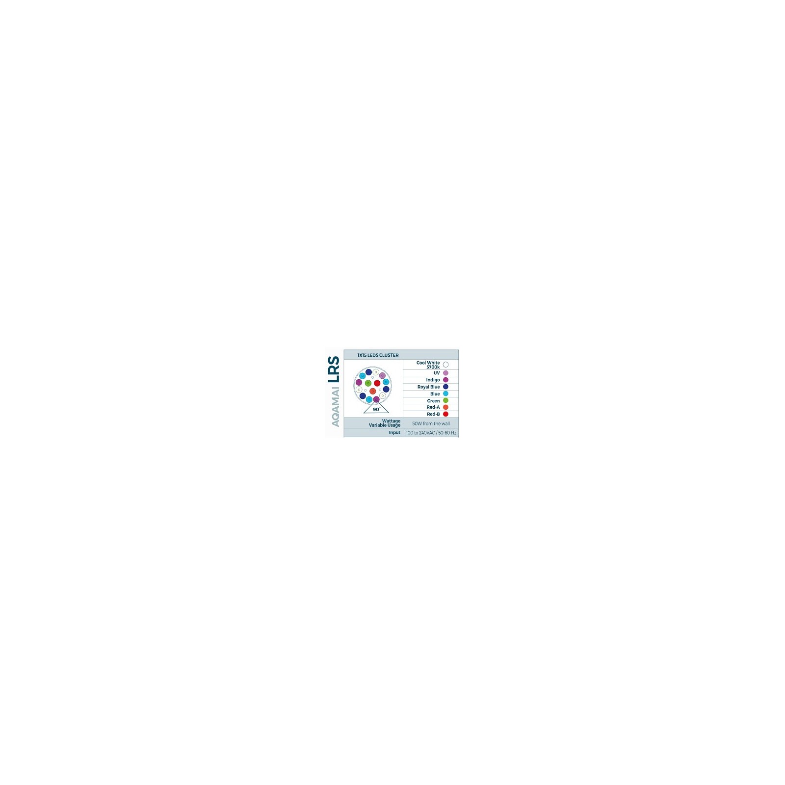 1 cluster of 15 leds: 3 hot white, 1 UV, 2 Indigo, 3 Royal Blue, 3 Blue, 1 Green, 1 Red A and 1 Red B