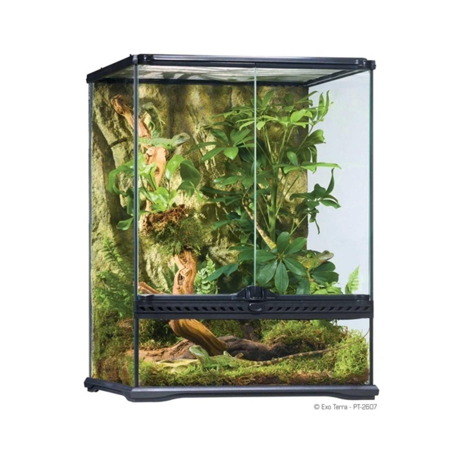 The base of the terrarium is raised to allow the mounting of a heating mat and heat a part of the extended fund. The high fixed front glass is ideal for thick layers of substrate (for excavator reptiles), aquatic parts (paludariums) or to mount a ladder for ESO Earth reptiles. The natural background has the same color as many other EXO Earth decorative elements (water bowls, waterfalls, heating rocks, etc.) and offers an extra size for climbing.