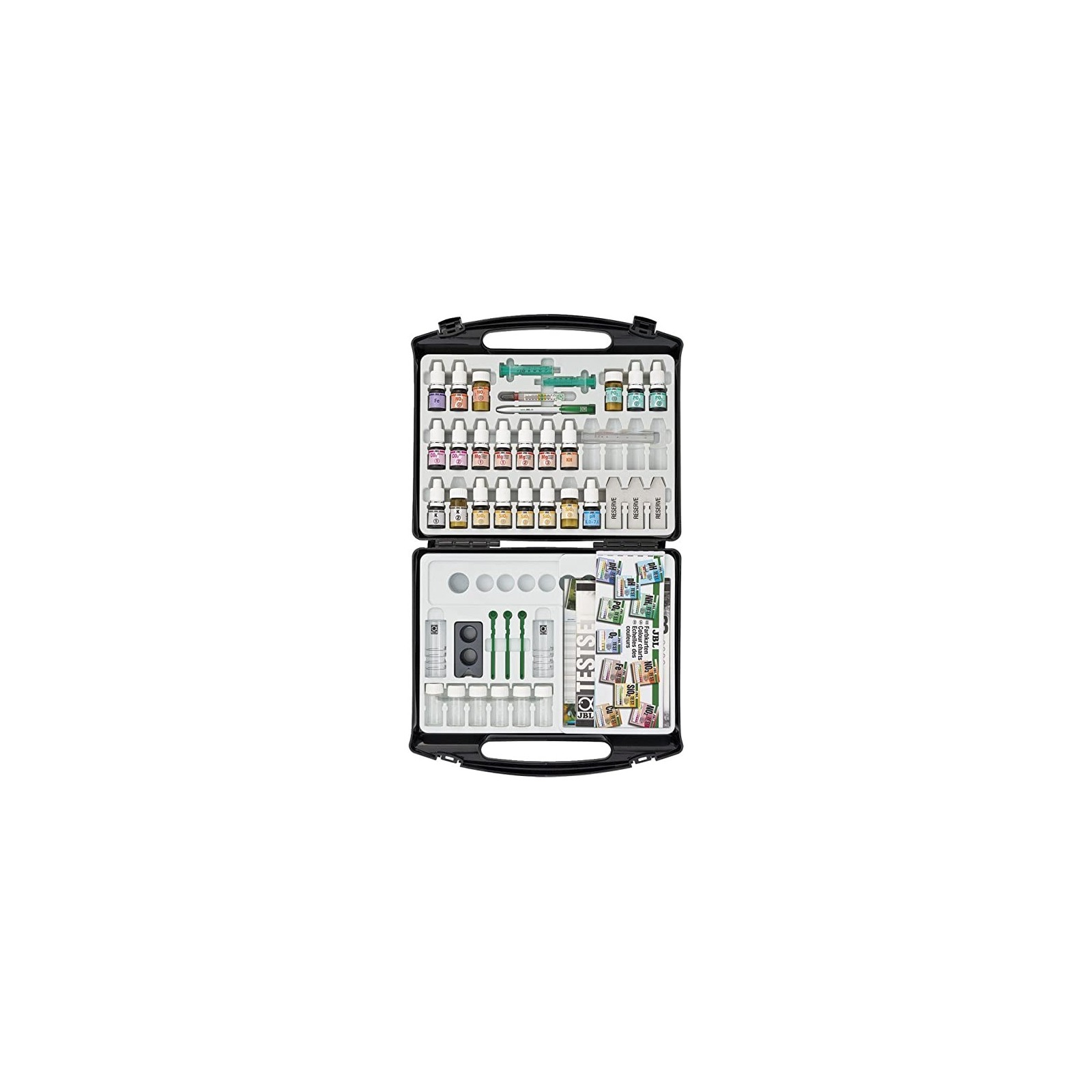 Content: 1 analysis briefcase for flat aquariums with 9 reagents, 6 glass tubes, 2 syringes, 3 tablespoons, thermometer, comparative block, 2 plastic tubes, colorimetric cards, biro, protocol cards, instructions for use