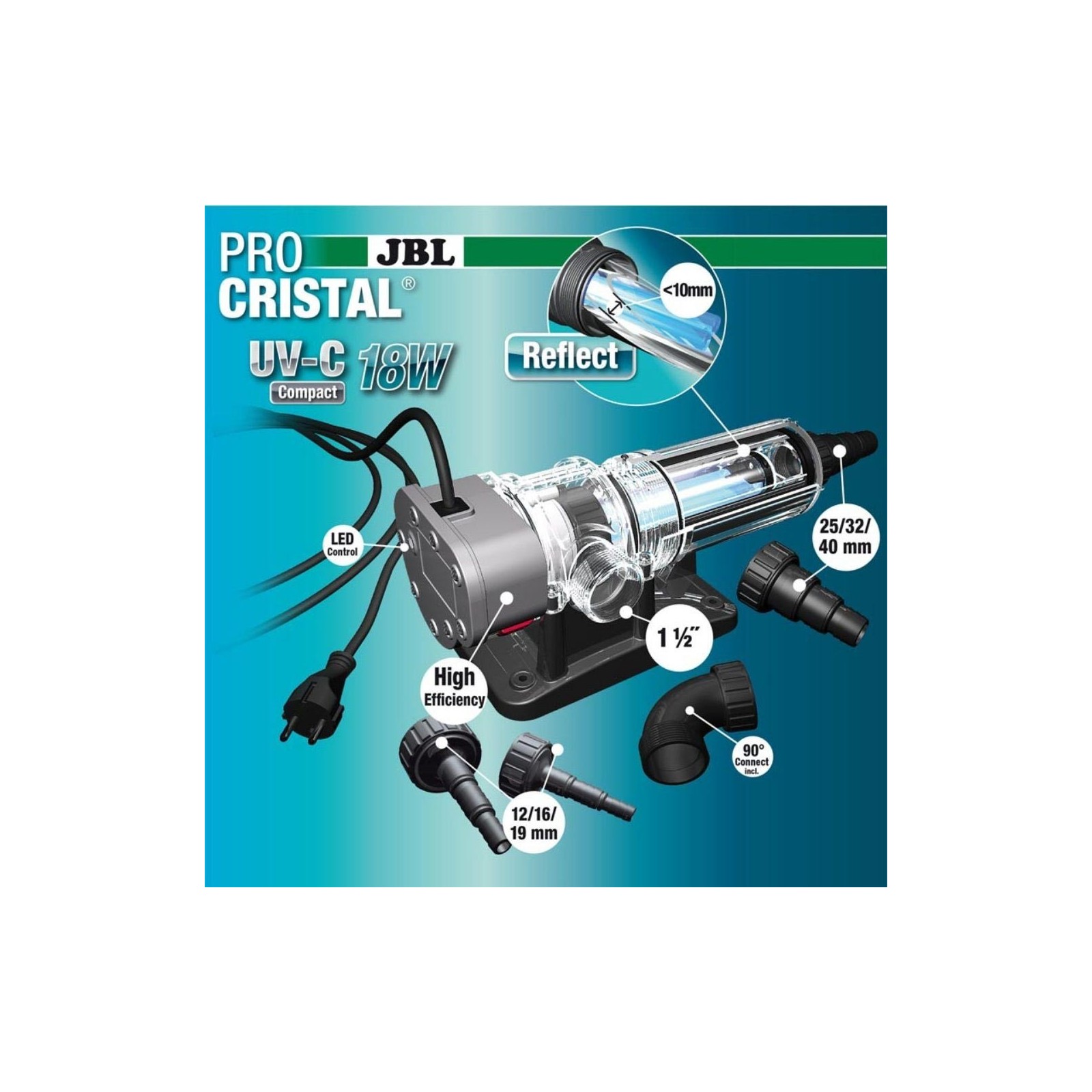 Unsuitable light conditions, hyperfertilization or even too much of nutrients can have a negative effect on aquarium water and promote algae growth. Floating algae create green plastering, whitish bacteria. These numbnesses are eliminated by the sterilizer JBL. Aquarium water passes through the stable UV-resistant housing of the sterilizer. UV-C radiation kills bacteria, other pathogenic germs and floating algae in the passing water. The efficiency of this UV-C sterilizer is very high because the glass cylinder is wrapped in a stainless steel film, polished and reflective. This rejects UV-C radiation, doubling its efficiency. This may also have a positive effect since it removes persistent algae such as e.g. the filiforms, since their spores are largely killed.