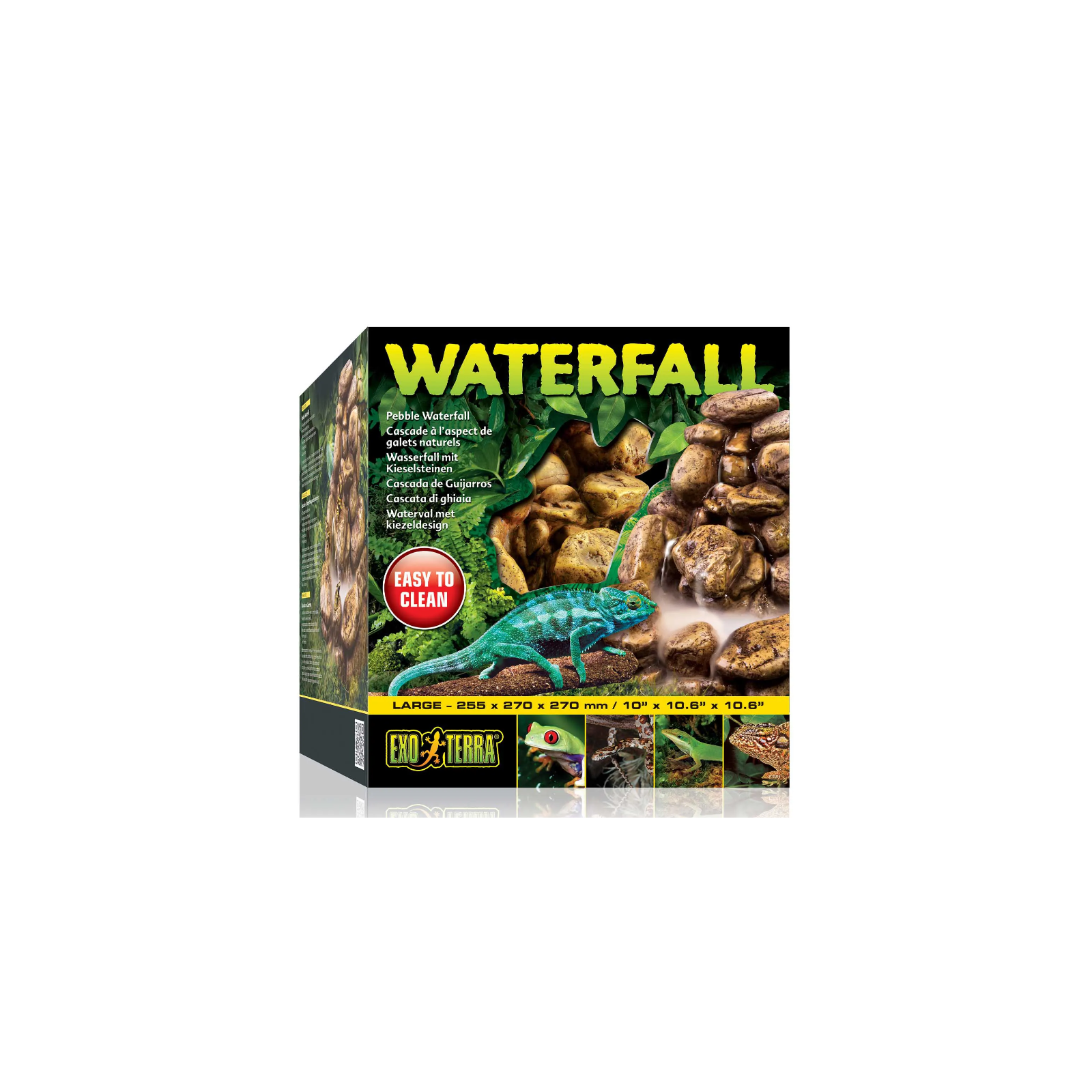 La Cascata Effetto Ciottoli Exo Terra riproduce l’aspetto naturale di un piccolo ruscello, perfetto per ogni tipo di terrario. Il flusso d'acqua stimola il comportamento naturale di idratazione nei rettili, come camaleonti, anolidi e draghi d’acqua, ed è ideale per ambienti tropicali in quanto contribuisce ad aumentare il livello di umidità.